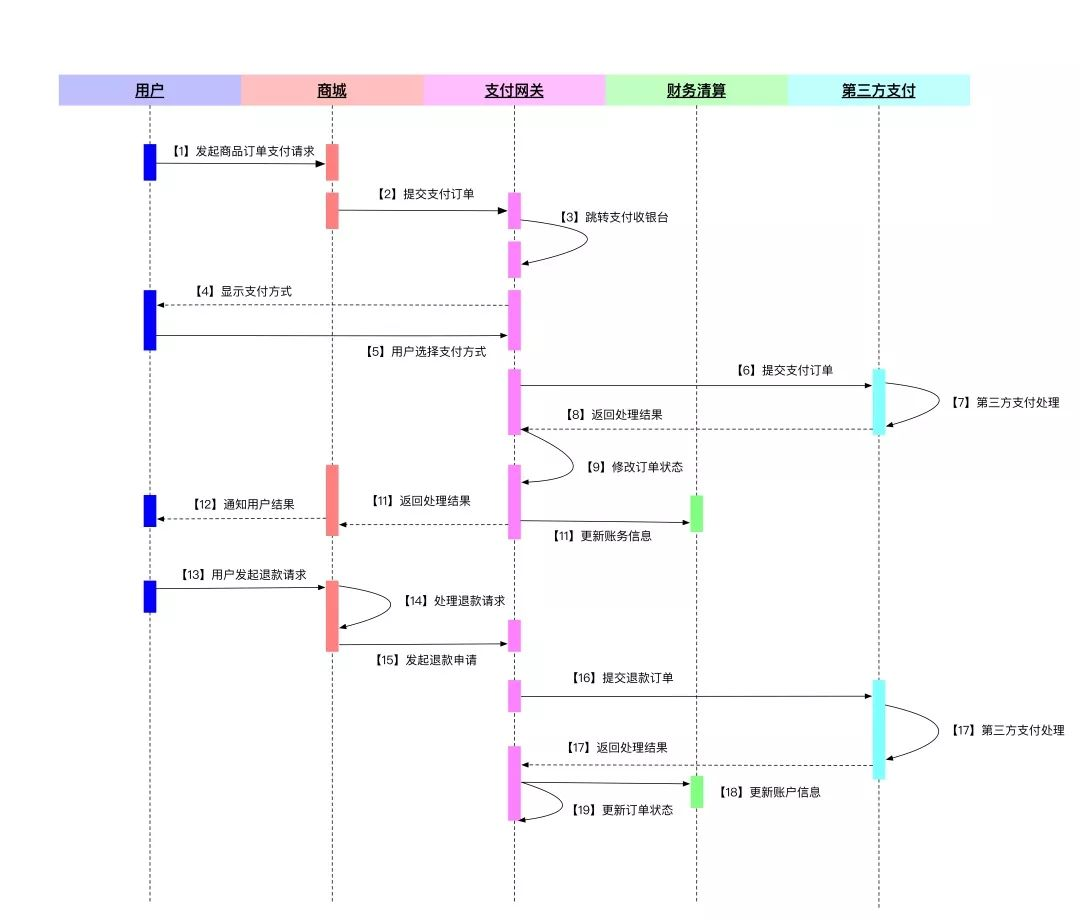 - 网管前置 -- 参数校验 -- 路由选择 -- 风险评估 -- 发送消息 --更新订单--异步通知--交易订单生成--交易流水和记账 --支付路由--渠道接入