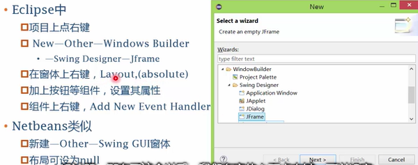 init() add(xx) btn.addActionLIstener.处理事件 acrionPerformed().具体处理事件