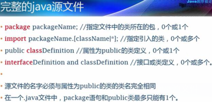 package 语句(0/1句) import 语句(多个)导入其他类的类库 类定义-class(多个)一个文件只能有一个public类(与文件同名)