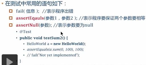 测试函数 @Test fail/assertEqauls(参数1,参数2) assertNull(参数)