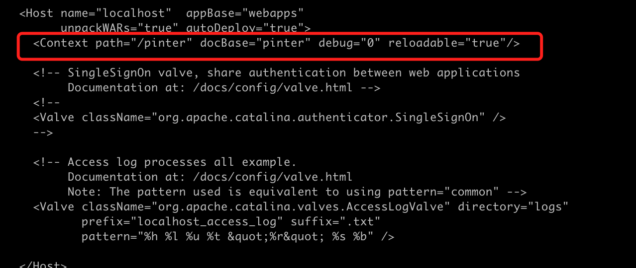添加"<Context path="/路径" docBase="项目在webapps中的路径" debug="0" reloadable="true"/>"