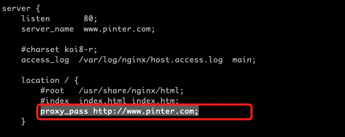 4、将server下面的location 中的root和index都注释掉,增加一个proxy_pass 域名;