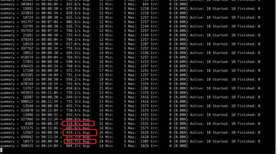 我们可以从上图看出来这个tps在缓慢的下降,持续压测的话应该为继续下降,甚至降低到0