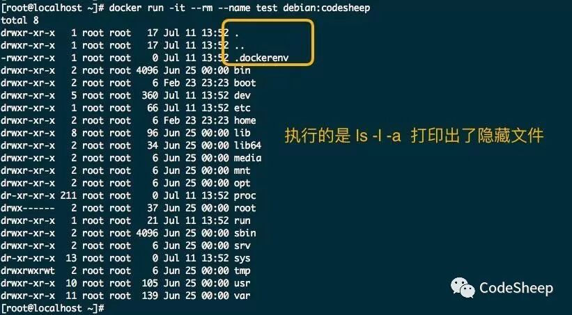 若以默认命令运行容器,可以发现,执行的是 ls-a-l 命令: