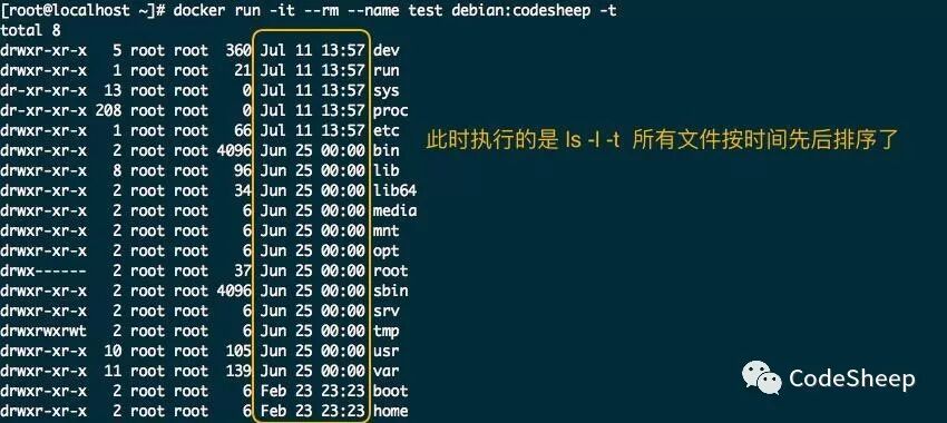 也可以发现执行的是 ls-l-t,即 Dockerfile 中的 CMD 原参数被覆盖了: