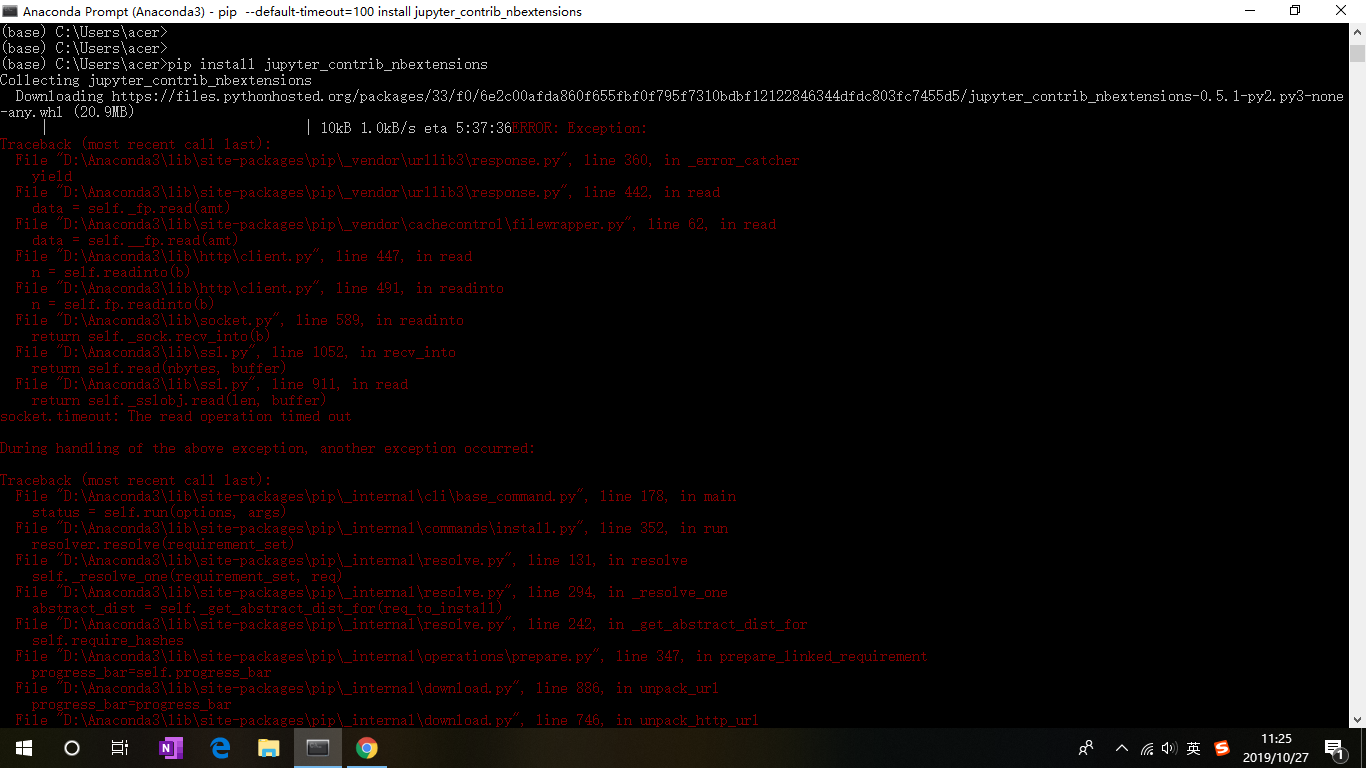 将pip install jupyter_contrib_nbextensions 改为 pip --default-timeout=100 install jupyter_contrib_nbextensions