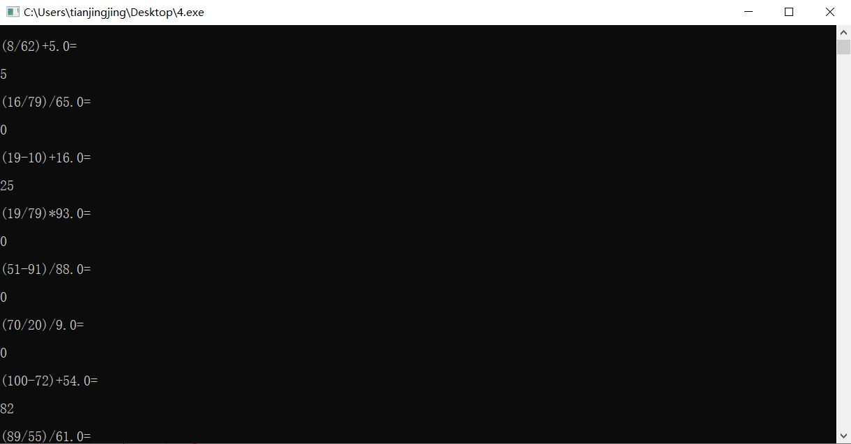 T:第一次接触到结对编程,两个人合作进行代码编辑,互相帮助,在对方编辑代码时可以注意纠错,提高了效率。同时在纠正对方的同时,也会加深自己的印象,在以后的代码编辑中会注意到相关问题,两个人共同进步。由于我们编辑代码有些内容不够熟练,导致刚开始在编辑程序时虽然能够执行,但是产生的随机数是重复的。C++产生随机数,我们都知道,无非就是利用srand产生一个种子,然后利用rand函数产生随机数即可。但是在我们最开始完成的代码中,虽然程序执行顺利,要求也基本符合,但是生成的算式几乎是一样的。在查阅完资料后发现,电脑性能足够,程序运行的足够快,循环的每次(或者准确的说是前几次)每次srand()函数中获取的系统时间都是一致的,那么执行每次rand函数之前,设置的种子都一样,就和没设置种子一样了,这样导致了产生的随机数就是一样的。解决办法其实很简单,就是不要将srand函数放在类的函数内部,最好把它放在主函数中,这样就相当于设置了一次种子,但是产生了多次随机数。