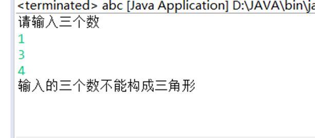 package test; import java.util.Random; import java.util.Scanner; public class abc { public static void main(String[] args) { Scanner input=new Scanner(System.in); System.out.println("请输入三个数"); int a=input.nextInt(); int b=input.nextInt(); int c=input.nextInt(); if ((a+b>c)&&(a+c>b)&&(b+c>a)) { System.out.println("输入的三个数能构成三角形"); } else { System.out.println("输入的三个数不能构成三角形"); }