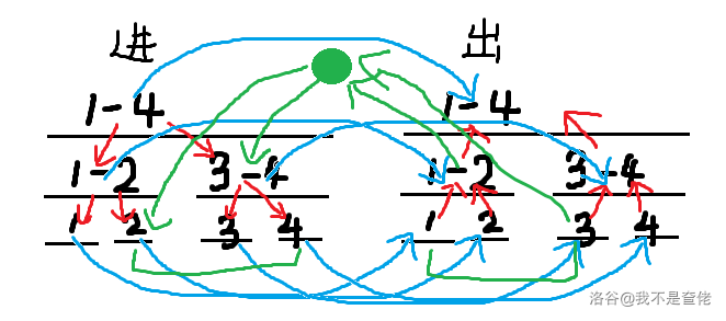 现在为止,我们还差一种边,我们现在从出树出发到达入树后就走不了了TmT,而我们所有的连边都是从出树指向入树,所以我们要讲入树和出树的每一个对应区间节点都连边(入树指向出树),这样我们就可以愉快地回来啦。