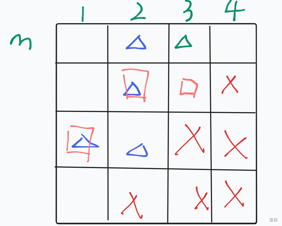 绿色的三角表示当前的 \(f_{m,k}\),而通过前面的推导已经知道了它关于这些未知数的表达式了,但是有趣的来了,这个点还可以使用粉色正方形来转移,发现这两者的转移并不完全一致,所以可以借此列出方程从而解得所有未知数,然后使用 \(f_{n,k}\) 的转移系数算出即可。