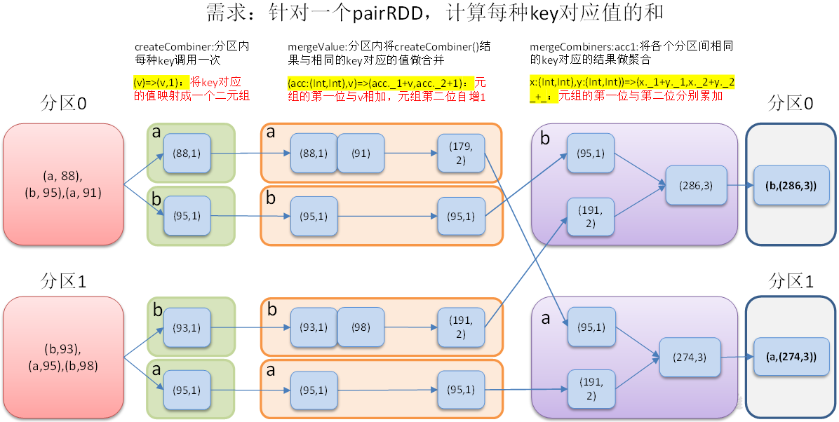 **参数:(createCombiner: V => C, mergeValue: (C, V) => C, mergeCombiners: (C, C) => C) **