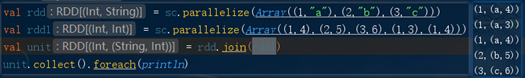res13: Array[(Int, (String, Int))] = Array((1,(a,4)), (2,(b,5)), (3,(c,6)))