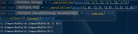 res14: Array[(Int, (Iterable[String], Iterable[Int]))] = Array((1,(CompactBuffer(a),CompactBuffer(4))), (2,(CompactBuffer(b),CompactBuffer(5))), (3,(CompactBuffer(c),CompactBuffer(6))))