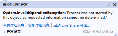 当我执行时,果然在Process.GetCurrentProcess().StartInfo出现了InvalidOperation异常,至此我们将异常范围缩小到了StartInfo属性。