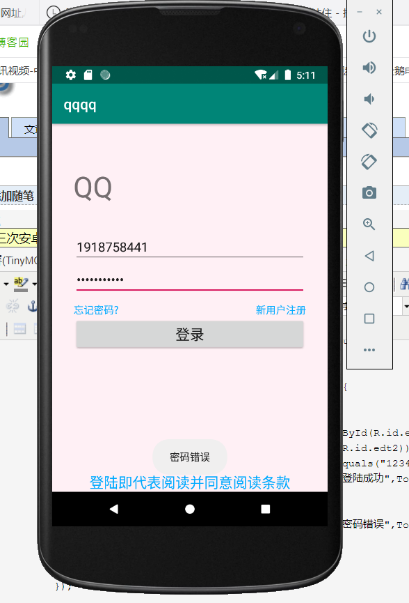 <?xml version="1.0" encoding="utf-8"?> <RelativeLayout xmlns:android="http://schemas.android.com/apk/res/android" android:layout_width="match_parent" android:layout_height="match_parent" android:background="#FFF0F5"> <LinearLayout android:layout_width="match_parent" android:layout_height="wrap_content" android:layout_marginTop="30dp" android:orientation="vertical" android:padding="30dp"> <TextView android:id="@+id/text1" android:layout_width="wrap_content" android:layout_height="wrap_content" android:drawableLeft="#333fff" android:text="QQ" android:textSize="40sp" /> <EditText android:id="@+id/edt1" android:layout_width="match_parent" android:layout_height="match_parent" android:layout_marginTop="35dp" android:hint="QQ号/邮箱/手机号" /> <EditText android:id="@+id/edt2" android:layout_width="match_parent" android:layout_height="match_parent" android:hint="密码" android:password="true"/> <RelativeLayout android:layout_width="match_parent" android:layout_height="wrap_content" android:layout_marginTop="10dp"> <TextView android:id="@+id/text2" android:layout_width="wrap_content" android:layout_height="wrap_content" android:text="忘记密码?" android:textColor="#00aaff" /> <TextView android:id="@+id/text3" android:layout_width="wrap_content" android:layout_height="wrap_content" android:layout_alignParentRight="true" android:text="新用户注册" android:textColor="#00aaff" /> </RelativeLayout> <Button android:id="@+id/btn1" android:layout_width="match_parent" android:layout_height="wrap_content" android:text="登录" android:textSize="20sp" android:onClick="click"/> </LinearLayout> <RelativeLayout android:layout_width="match_parent" android:layout_height="wrap_content"> <TextView android:id="@+id/text4" android:layout_width="wrap_content" android:layout_height="wrap_content" android:layout_alignParentBottom="true" android:layout_centerHorizontal="true" android:layout_marginBottom="50dp" android:text="登陆即代表阅读并同意阅读条款" android:textColor="#00aaff" android:textSize="20sp" /> </RelativeLayout> </RelativeLayout>