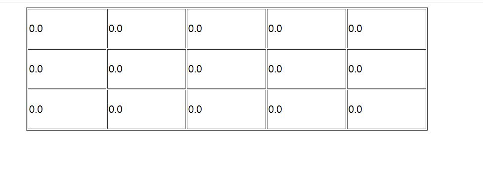 <!DOCTYPE html PUBLIC "-//W3C//DTD HTML 4.01 Transitional//EN" "http://www.w3.org/TR/html4/loose.dtd"> <html> <head> <meta http-equiv="Content-Type" content="text/html; charset=ISO-8859-1"> <title>Insert title here</title> </head> <body> <table border="1" width="650" height="200" align="center" > <tr> <td> 0.0 </td> <td> 0.0 </td> <td> 0.0 </td> <td> 0.0 </td> <td> 0.0 </td> </tr> <tr> <td> 0.0 </td> <td> 0.0 </td> <td> 0.0 </td> <td> 0.0 </td> <td> 0.0 </td> </tr> <tr> <td> 0.0 </td> <td> 0.0 </td> <td> 0.0 </td> <td> 0.0 </td> <td> 0.0 </td> </tr> <table> </body> </html>