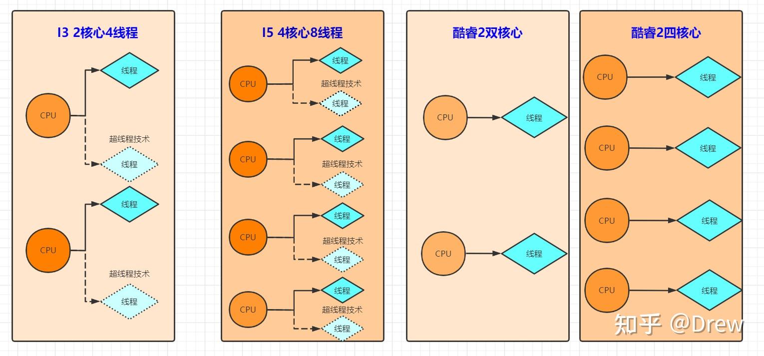 现在的I3就是2核心4线程,I5是4核心8线程,酷睿2双核是单纯的双核,酷睿2四核就是单纯的四核。
