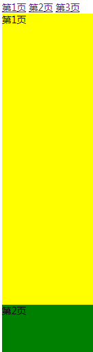 <!DOCTYPE html> <html lang="en"> <head> <meta charset="UTF-8"> <!--<meta http-equiv="Refresh"content="3; URL=https://www.baidu.com">--> <meta http-equiv="Refresh" content="3"> <title>Title</title> <style> #d1{height: 500px; background: yellow} #d2{height: 1000px; background: green} #d3{height: 2000px; background: red} </style> </head> <body> <a href="#d1">第1页</a> <a href="#d2">第2页</a> <a href="#d3">第3页</a> <div id="d1">第1页</div> <div id="d2">第2页</div> <div id="d3">第3页</div> </body> </html>