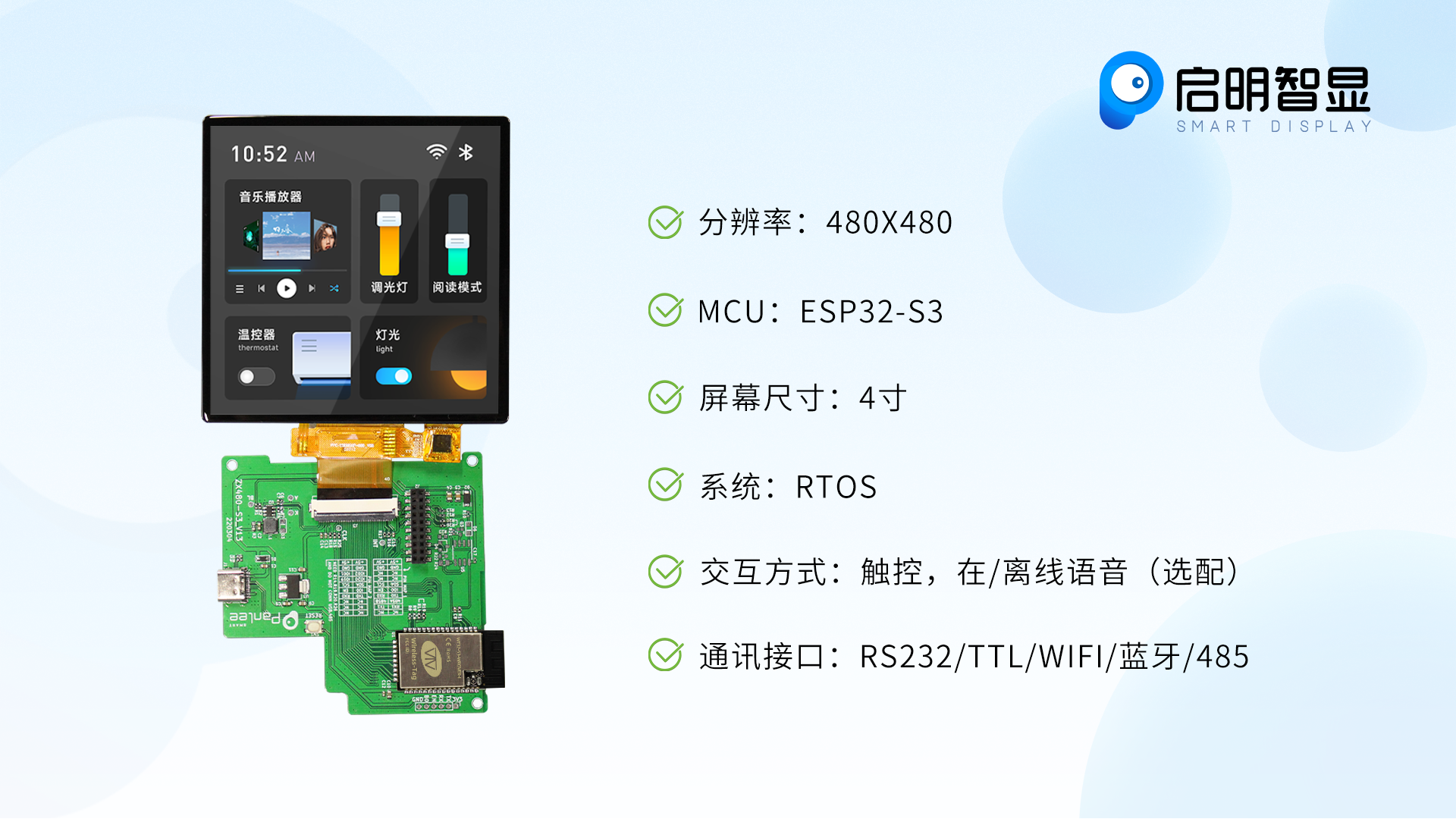 - 支持WIFI/蓝牙,可接入小米音箱、天猫精灵、小度智能音箱等智能蓝牙音箱,可通过APP进行远程操控,实现语音+触屏+按键+手机APP四大交互方式