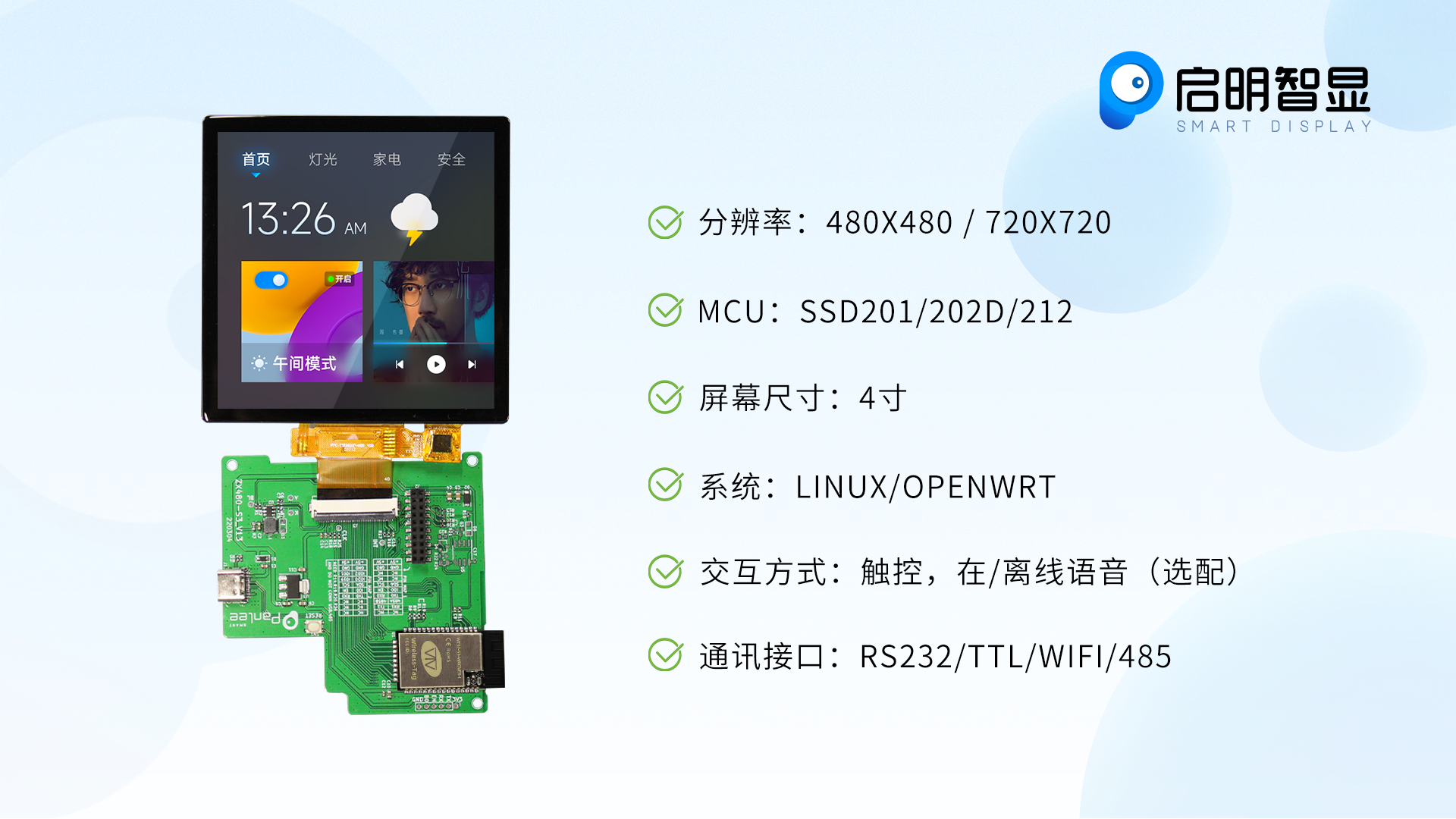 - 屏幕尺寸:4寸,480×480分辨率