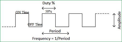 例如,如果总周期为10ms的脉冲保持 ON(高)5ms。然后,占空比将为:占空比 = 5/10 * 100 = 50%