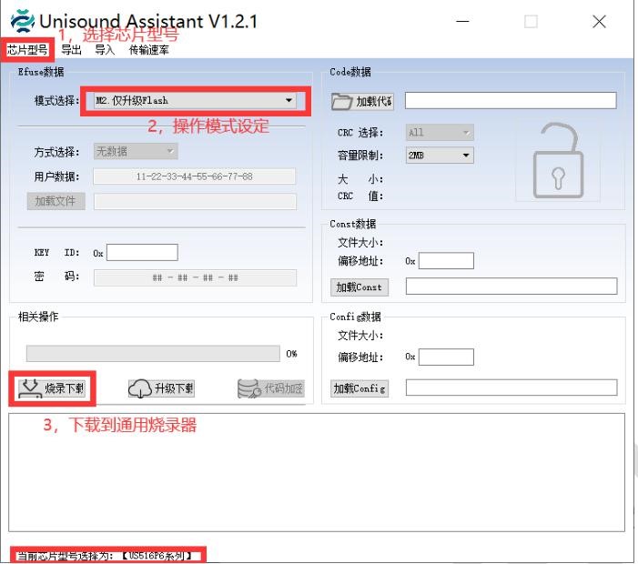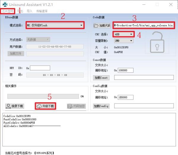 2. 打开上位机工具 Unisound Assistant,选择芯片型号US516P6,模式选择M2,加载代码 uni_app_release.bin,CRC 选择4KB。