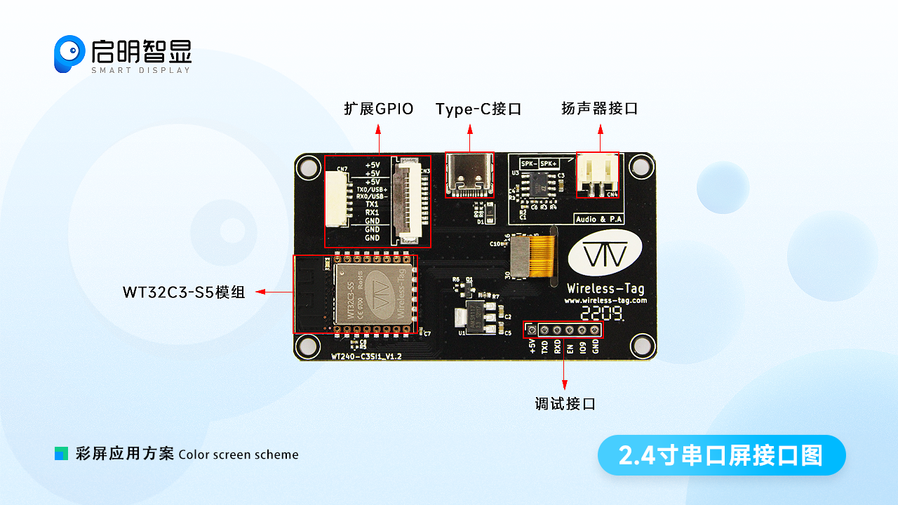 启明智显2.4寸串口屏,基于ESP32-C3与国产芯高效开发平台8ms设计开发的一款分辨率为320*240的IPS彩屏,支持WIFI、蓝牙,可实现设备联网、远程控制、数据可视化等功能,能够快速助力产品完成联网+彩屏+云端管理的升级应用。
