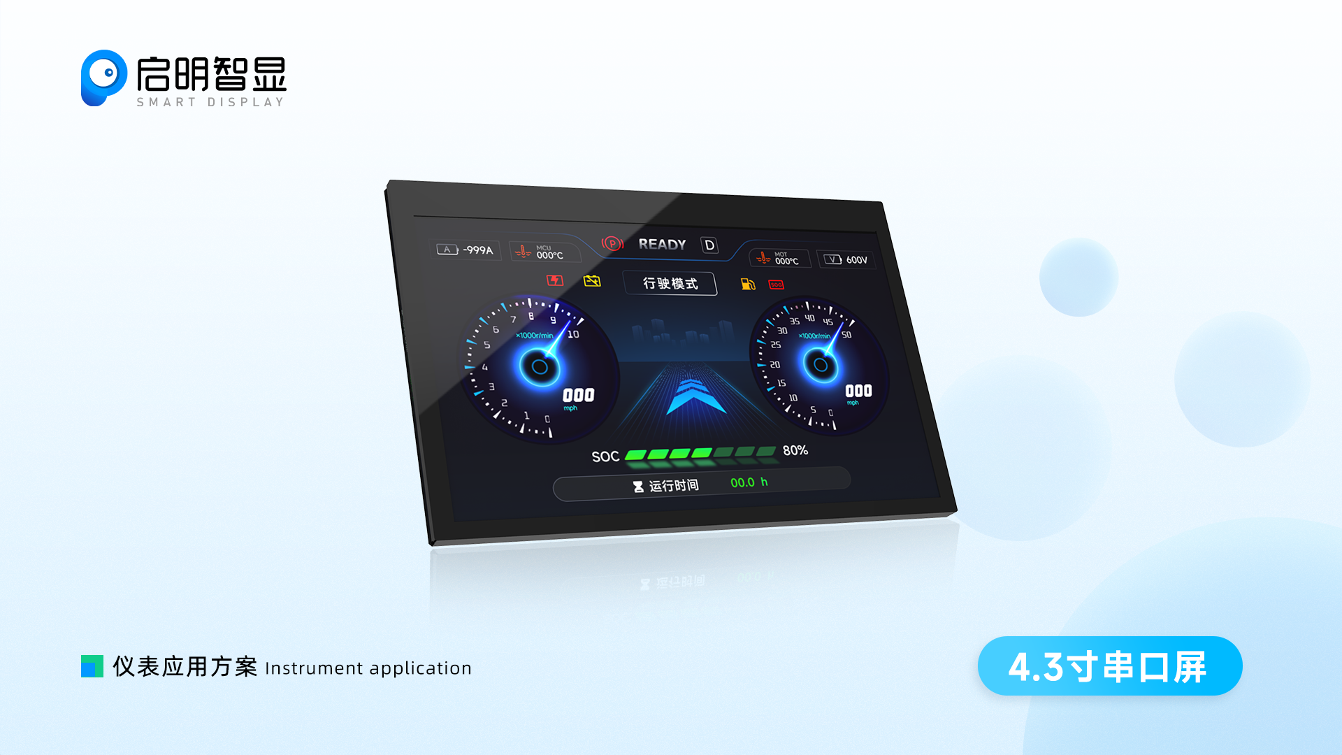 启明智显作为领先的智能屏解决方案提供商,推出的4.3寸串口屏可应用于两轮电动车仪表显示,打造产品差异,追求极致成本,满足消费群体对产品个性化、智能化、高性价比的追求。