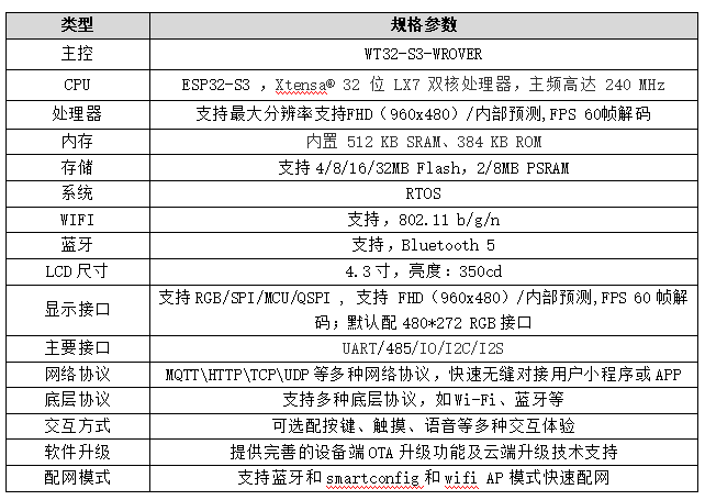 方案选型ZX4D30NEO1S智能串口屏选用4.3寸分辨率为 480(RGB)×272 全视角IPS工艺彩屏,采用 Xtensa® 32 位 LX7 双核处理器,主频高达 240 MHz,同时集成 2.4 GHz Wi-Fi 和 Bluetooth 5 (LE)。用一颗芯片替代原有的MCU主控芯片,在满足设备联网及彩屏显示的同时省“一颗芯”的成本。