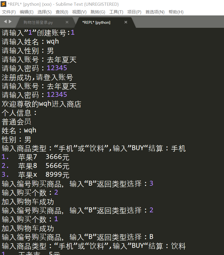 print("您购买的商品有:")