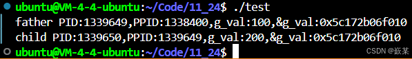 printf("child PID:%d,PPID:%d,g_val:%d,&g_val:%p\n",getpid(),getppid(),g_val,&g_val);