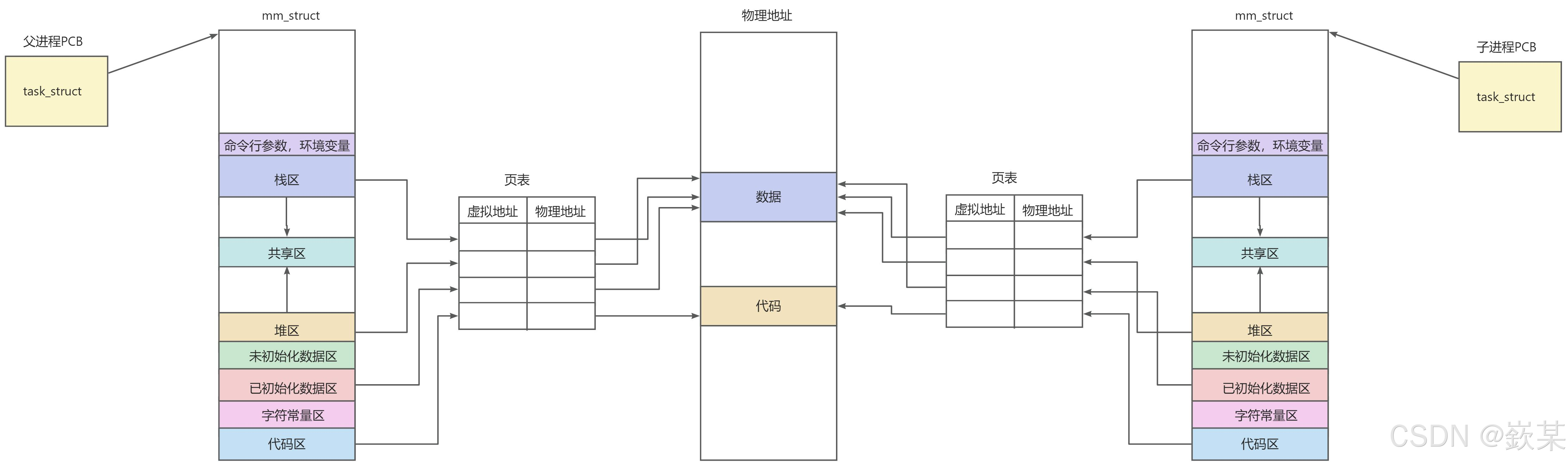 然后我们就可以更加深入解释上面地址相同,值却不同的现象:首先父进程有自己的task_struct和mm_struct,该父进程创建的子进程也会有属于其自己的task_struct和mm_struct,父子进程的进程地址空间当中的各个虚拟地址分别通过页表映射到对应的物理内存,如下图: