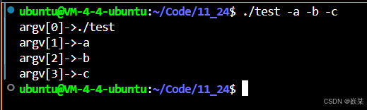 一共四个有效参数,第一个为./test ,第二个为-a,第三个为-b,第四个为-c,这三个参数都被保存在字符指针数组argv里面,argv数组的最后一个元素是NULL。