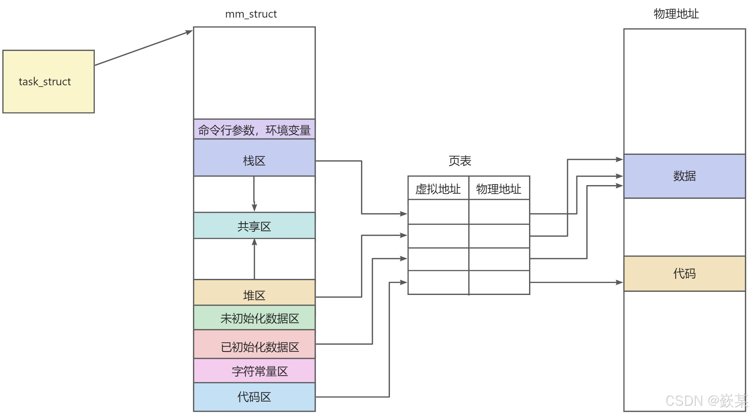 每个进程被创建时,其对应的进程控制块task_struct和进程地址空间mm_struct也随之被创建。而操作系统就可以通过进程的task_struct找到对应的mm_struct(因为task_struct有一个结构体指针指向的是mm_struct)。