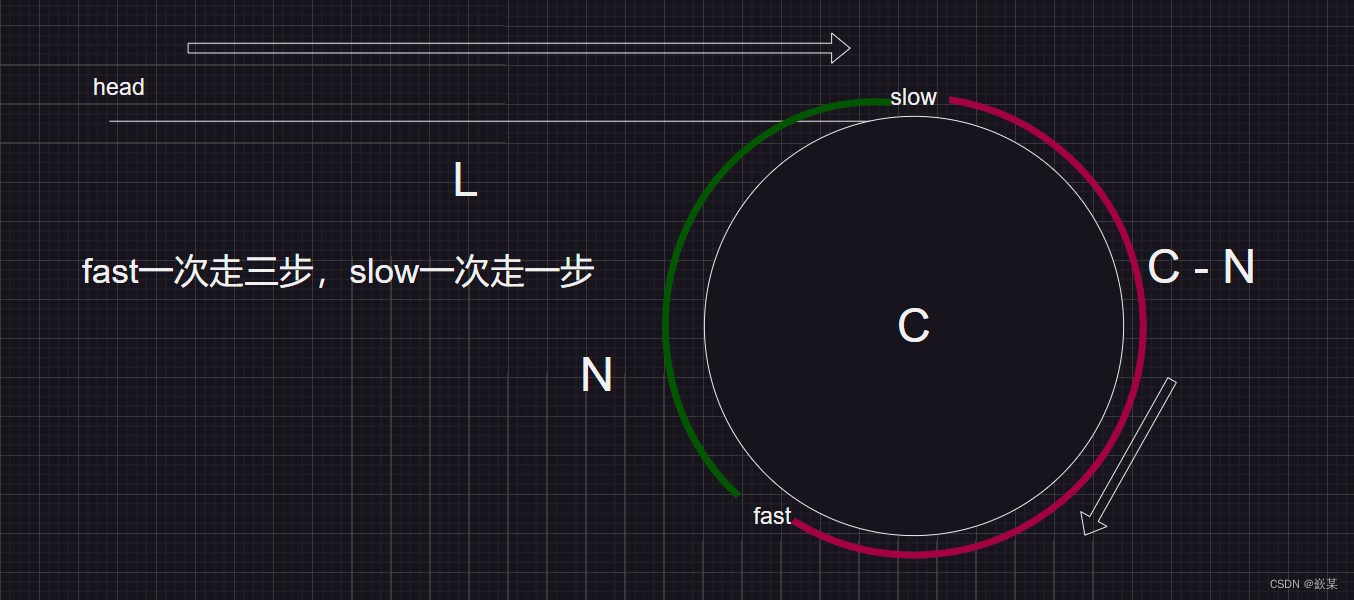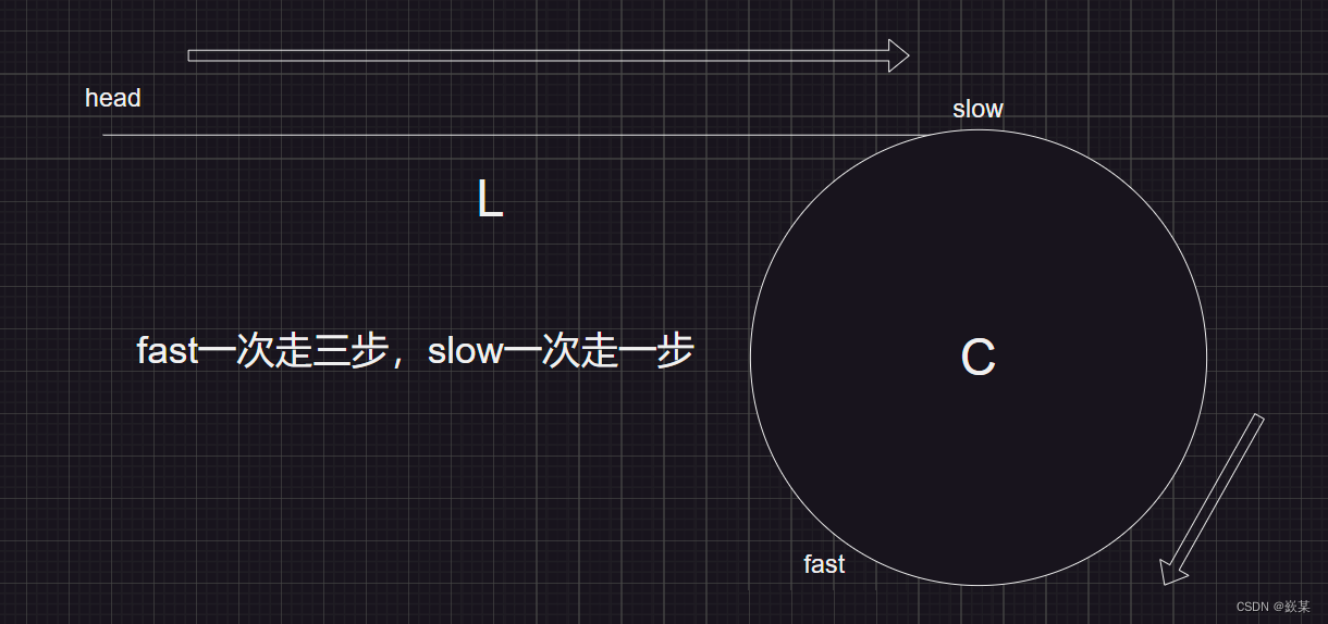 而slow只走了 L 这么长的距离,由于slow每次走一步,fast每次走三步,所以fast走的路程为slow的三倍,我们得到以下关系: