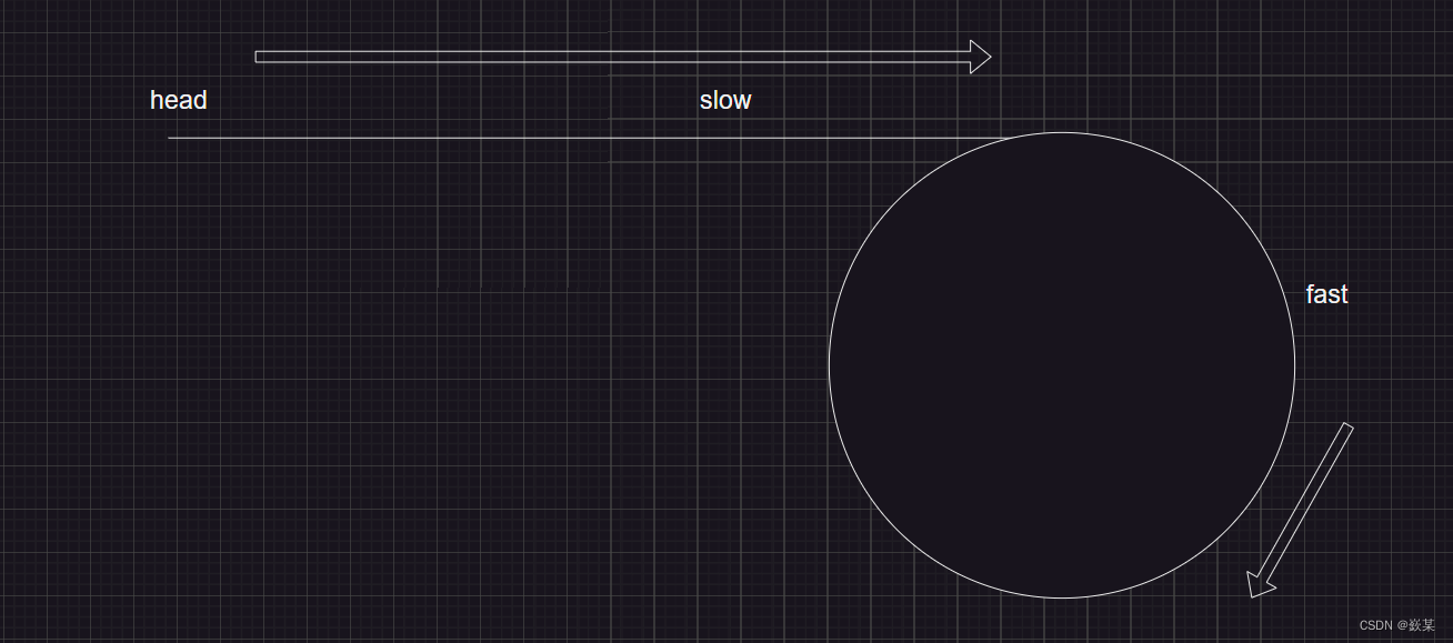 快慢指针:我们定义两个指针fast、slow都指向头节点,每一次循环让fast走两步,slow走一步。