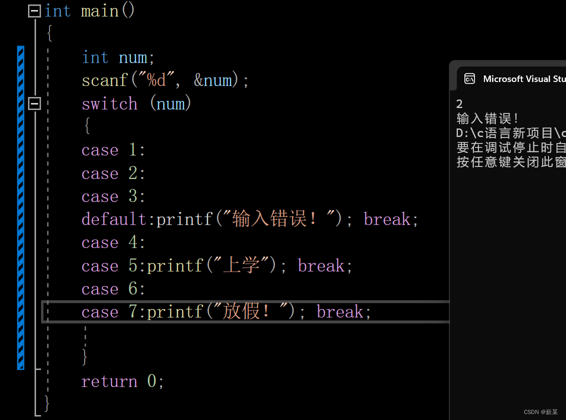 可以将上面的代码修改。如果输入1~5则输出 '上学',输入6,7输出 '放假'。如果输入的数字不是在1~7那么输出 '输入错误'。