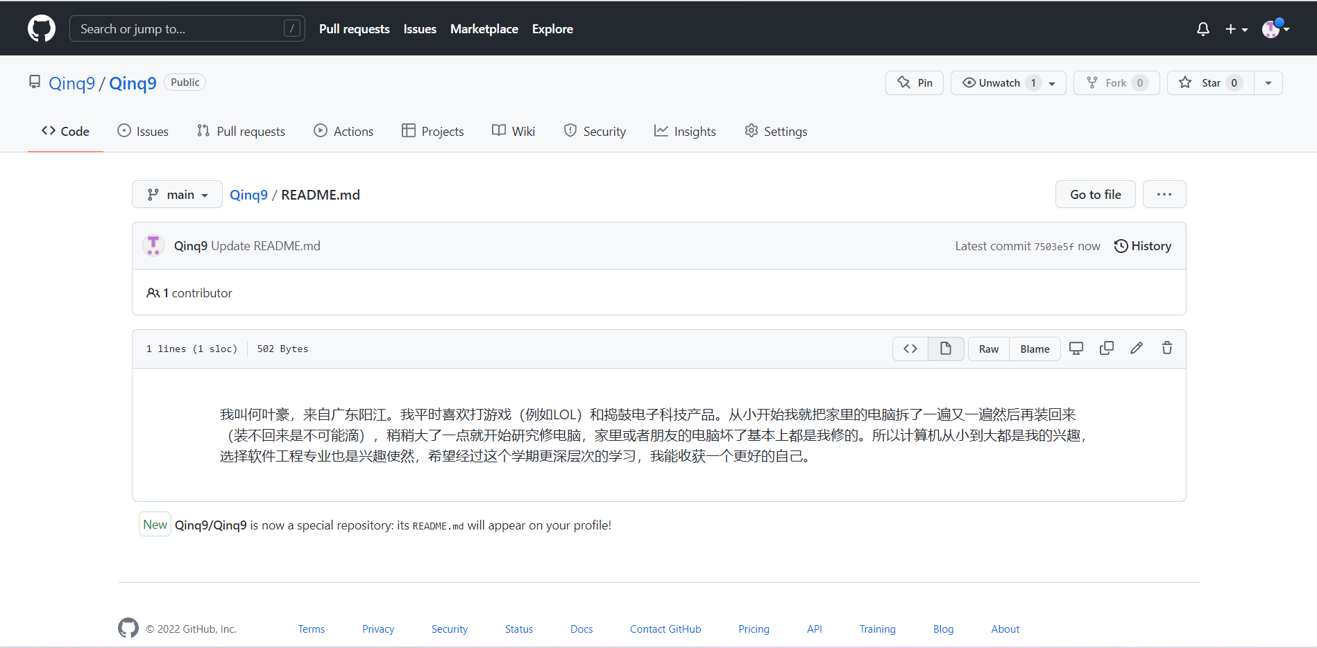 我叫何叶豪,来自广东阳江。我平时喜欢打游戏(例如LOL)和捣鼓电子科技产品。从小开始我就把家里的电脑拆了一遍又一遍然后再装回来(装不回来是不可能滴),稍稍大了一点就开始研究修电脑,家里或者朋友的电脑坏了基本上都是我修的。所以计算机从小到大都是我的兴趣,选择软件工程专业也是兴趣使然,希望经过这个学期更深层次的学习,我能收获一个更好的自己。