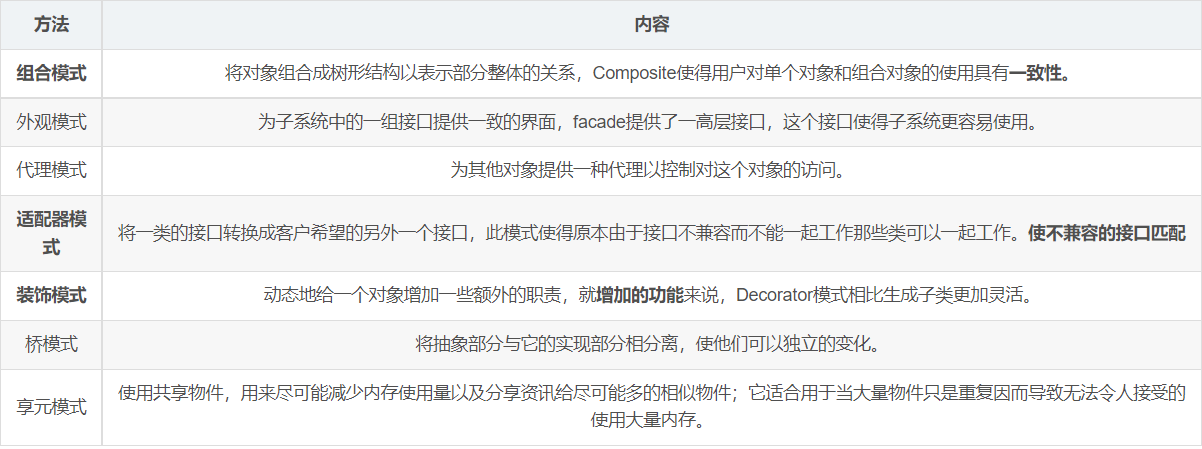 - 结构型模式,共七种:适配器模式、装饰器模式、代理模式、外观模式、桥接模式、组合模式、享元模式。