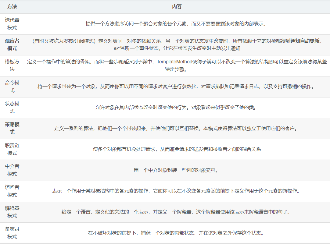 - 行为型模式,共十一种:策略模式、模板方法模式、观察者模式、迭代子模式、责任链模式、命令模式、备忘录模式、状态模式、访问者模式、中介者模式、解释器模式。