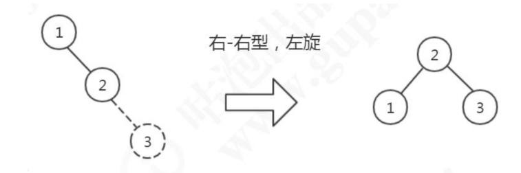 当我们插入节点1、2后,再插入3节点,此时会发现根节点1的左侧树深度为0,右侧子树深度为2,违反了平衡二叉树的定义,左右字数深度差绝对值不超过1。此时右子树深度为2,为右-右型,所以会把2提上去,这个操作叫做左旋。