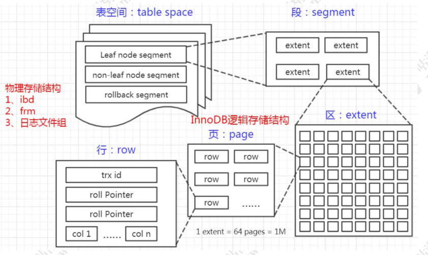 MySQL的存储结构分为5级:表空间 Tablespaces、段 Segments、簇 Extents、页 Pages、行 Rows。