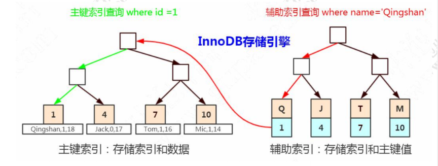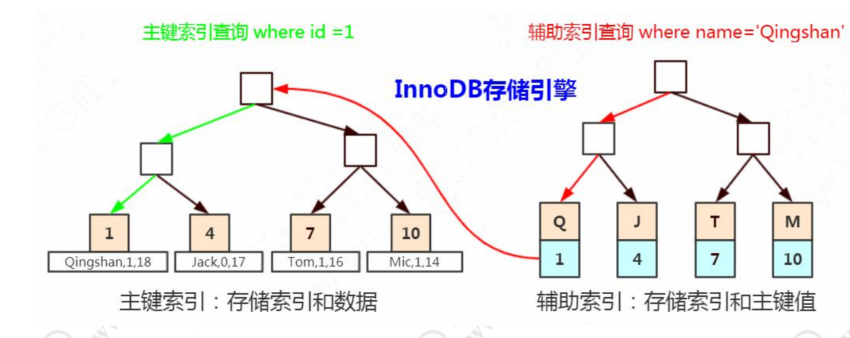 聚集索引(也是主键索引): 在InnoDB存储引擎中,有两种索引类型,主键索引也叫聚集索引,非主键索引都是非聚集索引(辅助索引)。