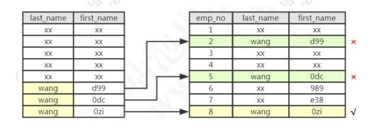 2、根据联合索引查出所有姓wang 的二级索引数据(3 个索引),然后从二级索引中筛选出first_name 以zi 结尾的索引(1 个索引),然后再回表,到主键索引上查询全部符合条件的数据(1 条数据),返回给Server 层。