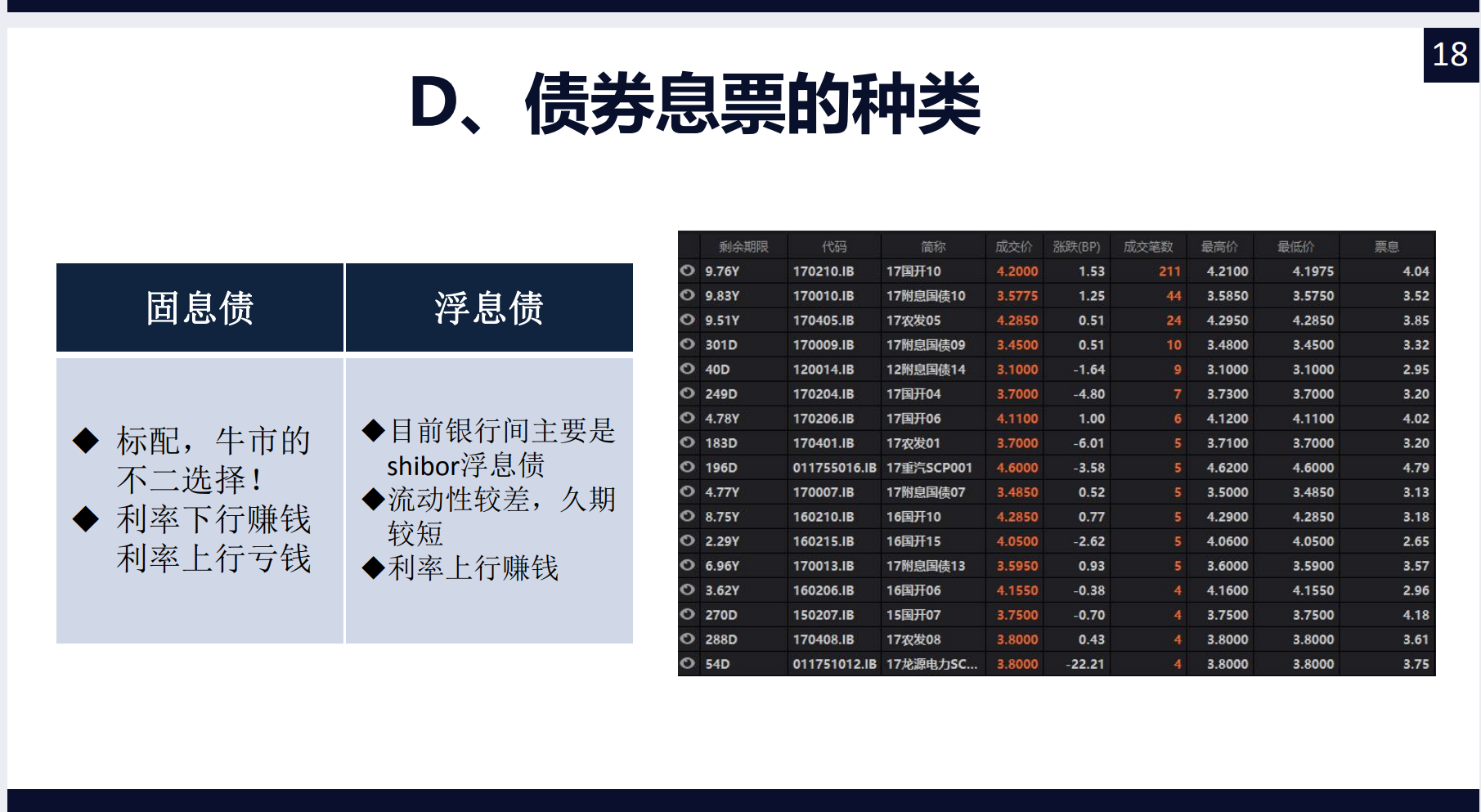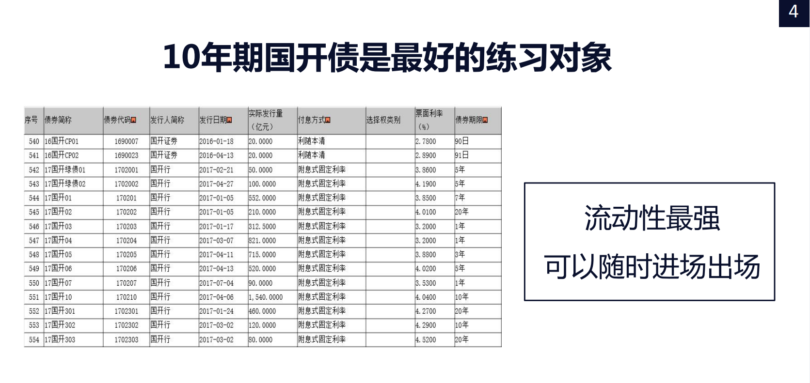 对于刚入行的交易员,推荐10年期的国开债,因为它有着最好的流动性,可以随时进场出场,轻松的完成一笔笔交易,方便总结提高