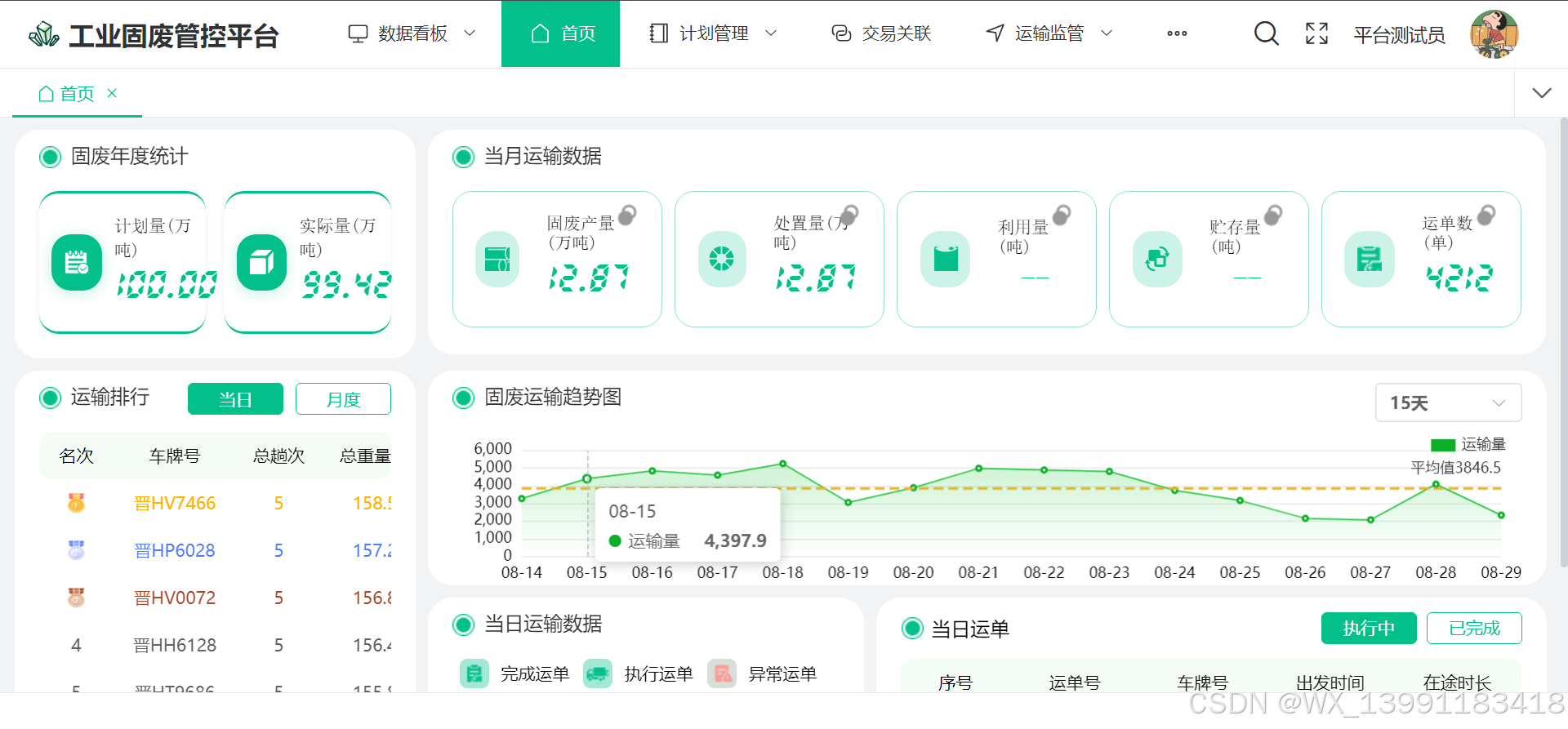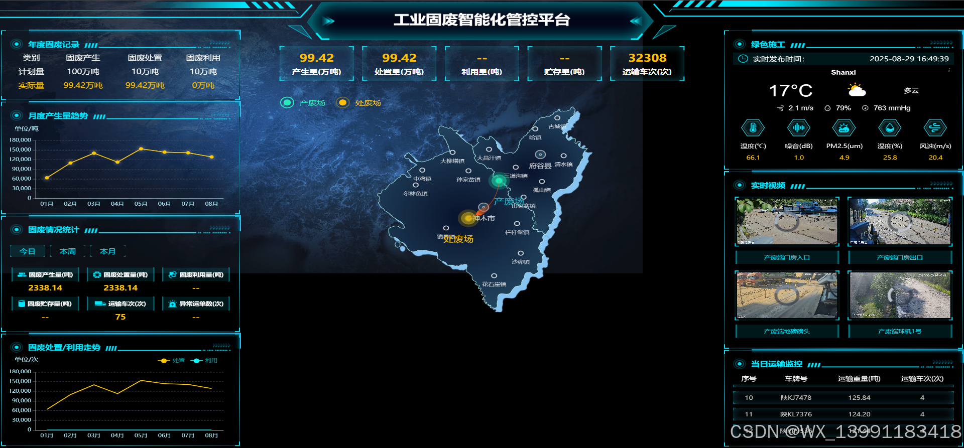 - 多源数据融合与决策支持 系统构建“固废一张图”驾驶舱,整合年度计划(支持《一般工业固体废物管理台账制定指南》附表1-7自动生成)、运输热力图、处废量趋势分析等模块。利用大数据技术关联气象、交通部门数据,预测运输效率与处置瓶颈,辅助制定产能调配方案。
