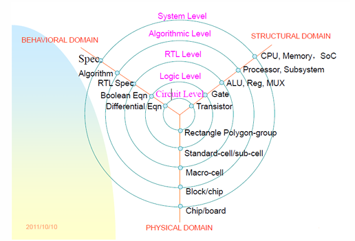 - 行为域:关注电路的功能和行为,在设计流程的早期阶段,行为域设计使用硬件描述语言来描述电路的行为,用于验证电路的功能正确性,进行高层次的仿真和验证;