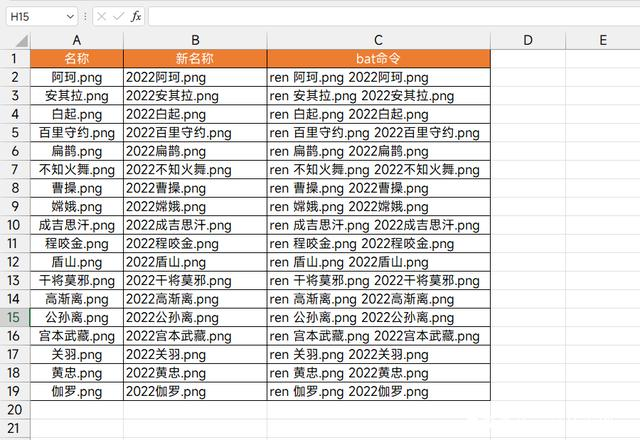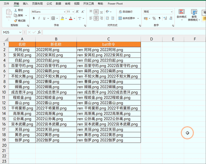 将图片名称提取到Excel之后,我们就需要来构建新的图片名称与Bat命令了。