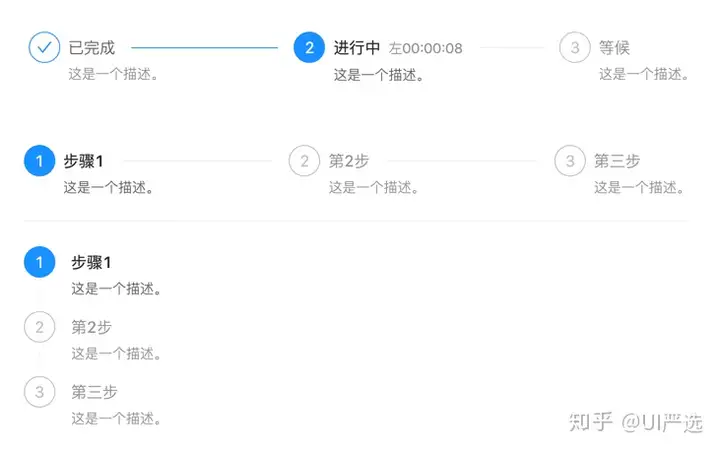 引导用户按照流程完成任务的分步导航条,可根据实际应用场景设定步骤,步骤不得少于 2 步。