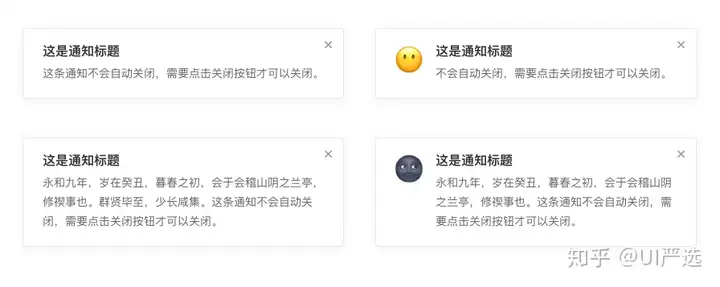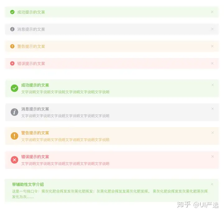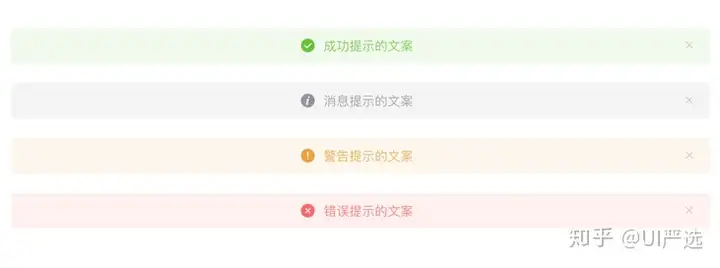 A. 当某个页面需要向用户显示警告的信息时。B. 非浮层的静态展现形式,始终展现,不会自动消失,用户可以点击关闭。